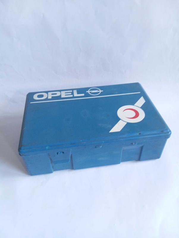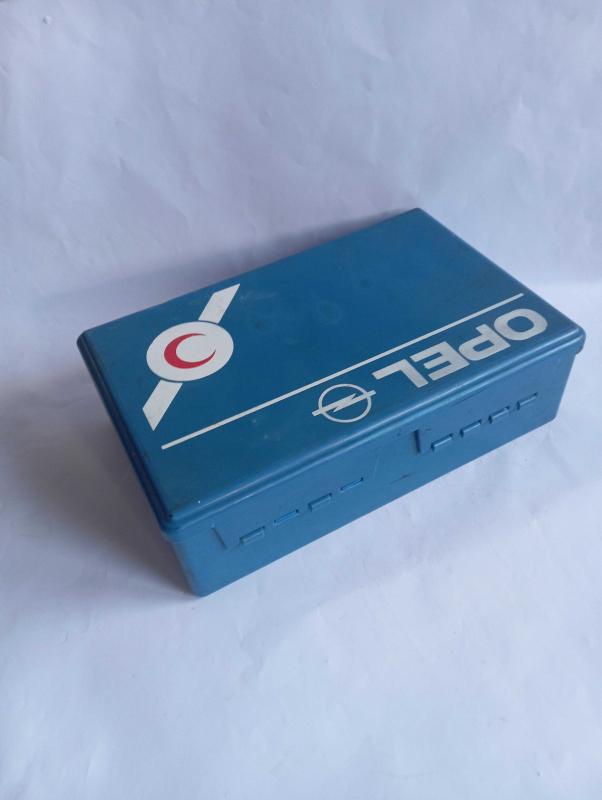 Eskilerden Opel araç ilk yardım çantası. Sert plastik başlıklı antika/koleksiyon objesinin menşei belirtilmemiştir. Objenin ait olduğu dönem bilinmeketedir.