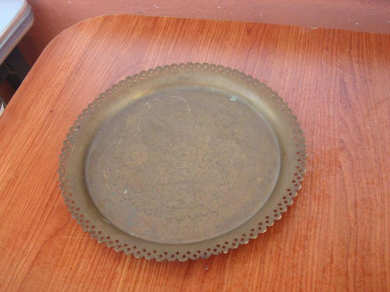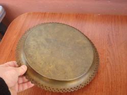 PİRİNÇ Servis / Çay Tepsisi ( İnce Kalem İşçilikle Desenler İşlenmiş ) " Ürün kullanılmış olup yüksek kondüsyondadır - Herhangi bir kırık,kopuk,ezik yoktur ,,sadece zamandan dolayı hafif kararma mevcut,,istenirse kolaylıkla parlatılabilir " Çap : 27 cm.