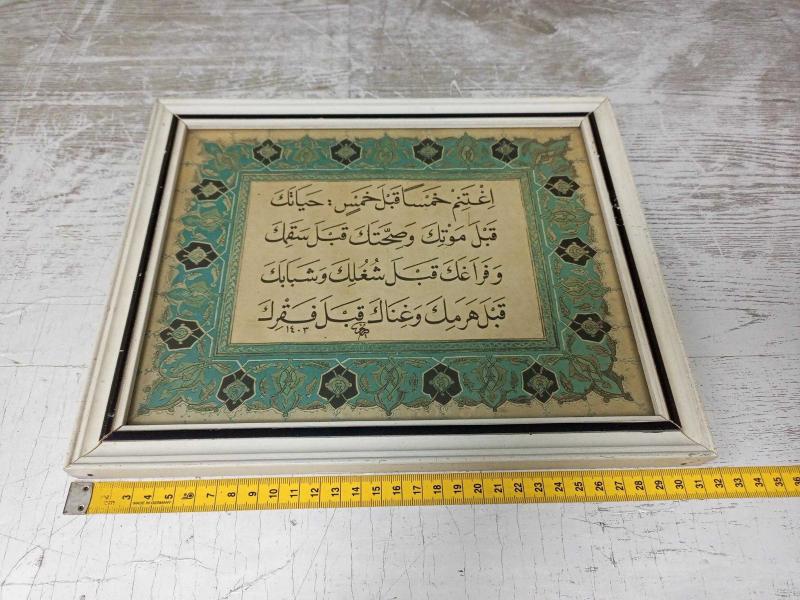Sizlere ١٤٠٣ - 1982 tarihli HATTAT SAİM ÖZEL'e ait özel baskı olup dönem ahşap çerçevesinde Eskilerden Tezhipli Hadis-i Şerif Hat Tablo sunuyoruz.. Hadis Çevirisi ; Beş şeyden önce beş şeyi ganimet bil: Ölümünden önce hayatını, hastalığından önce sağlığını, meşguliyetinden önce boş zamanını, ihtiyarlığından önce gençliğini ve yoksulluğundan önce de zenginliğini. BOLU ANTİK MAĞAZAMIZDAN SİZLERE SUNDUĞUMUZ DİĞER İLANLARI PROFİLMİZDEN GÖREBİLİRSİNİZ.