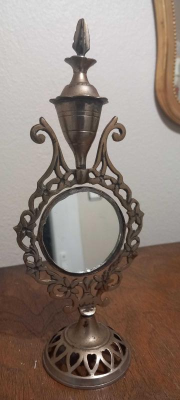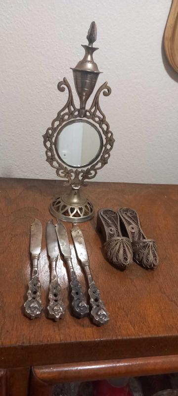 Eskilerden büyük boy aynalı prinç sürmedanlık 4 ad prinç bıçak 1 çift telkari nalın başlıklı antika/koleksiyon objesi Asya menşe’lidir. 1950-1999 arası dönemine aittir.