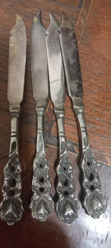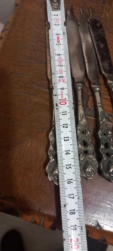 Eskilerden büyük boy 1 ad aynalı prinç sürmedanlık 4 ad gümüş kaplı sapları işlemeli prinç bıçak 1 çift telkari ceviz nalın ölçüler resimde mevcut sağlamdır