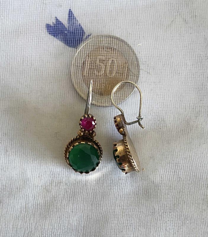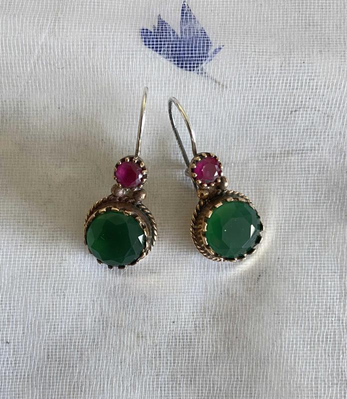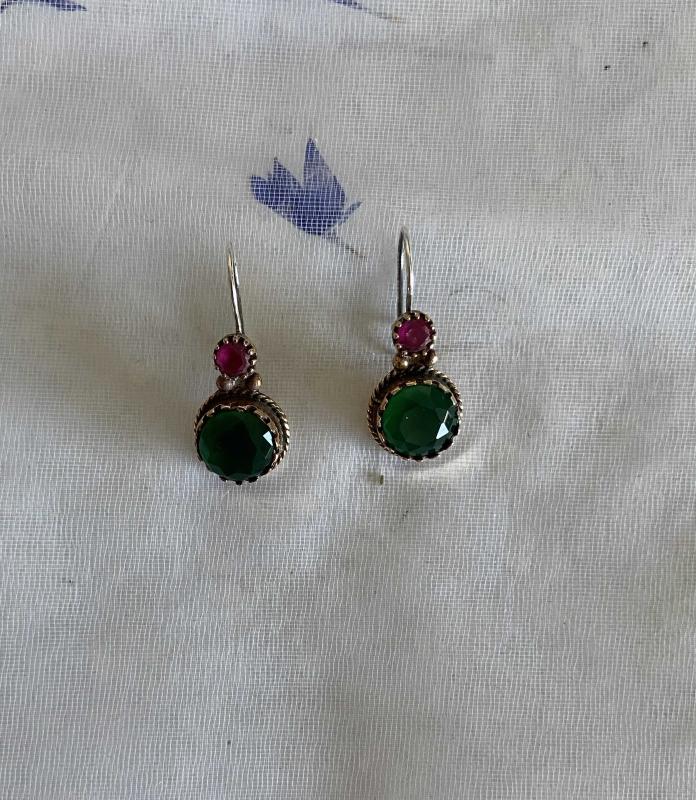 * Eskitme, altın küpe görselinde döküm bronz küpe. * Etlik kısmı gümüş (alerji yapmaz) diğer kısımları bronzdur . * Taşları yakut ve zümrüt görünümlü camdır. * Zevkle kullanacağınız otantik bir model.
