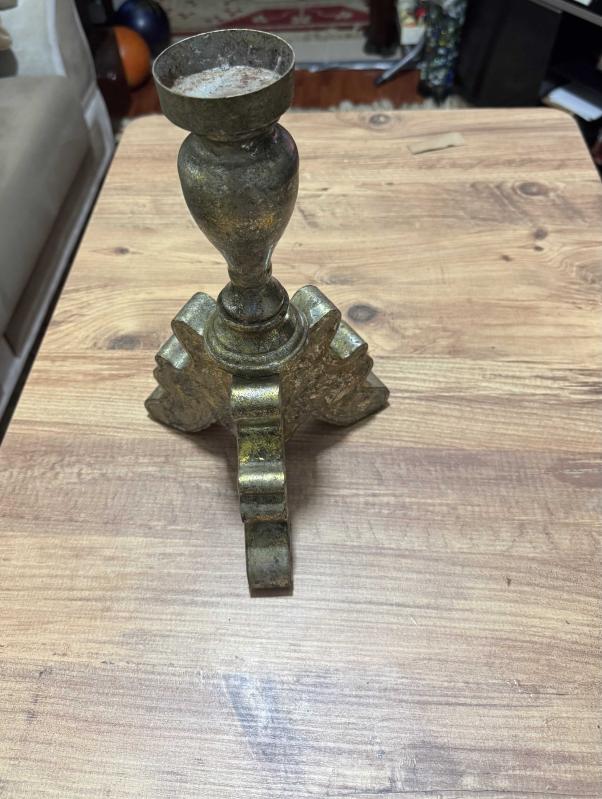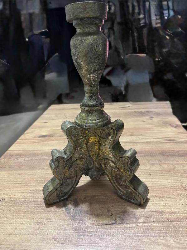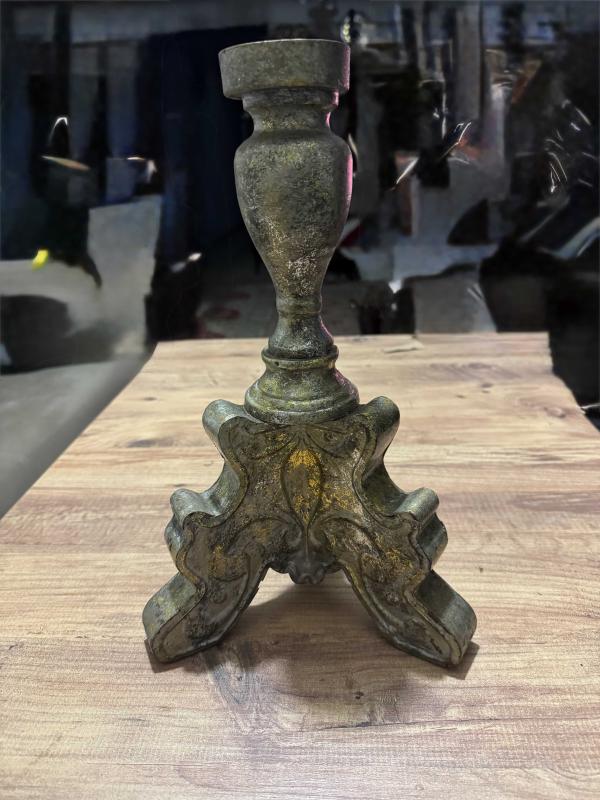 Eskitme altın tonlarında, ağır ve tok metal malzemeden üretilmiş vintage şamdan. Klasik işlemeli ayak yapısı ve zarif formuyla ev dekorasyonuna otantik bir hava katar. Temiz durumdadır, herhangi bir kırığı yoktur. Boy 35 cm