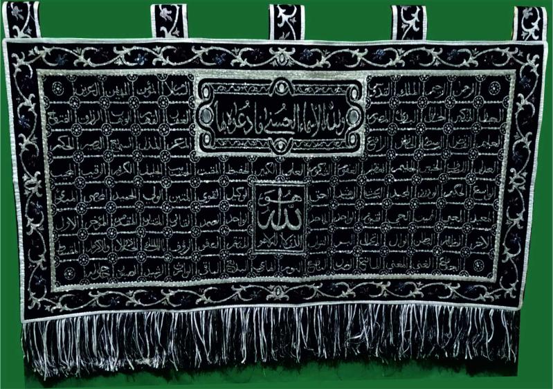Esmaül Hüsna Allah'ın 99 ismi, taş ve boncuklarla, Halep el işleme, simli kumaş üzerine, özel üretim.