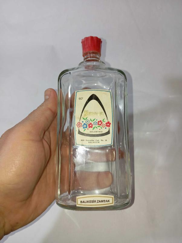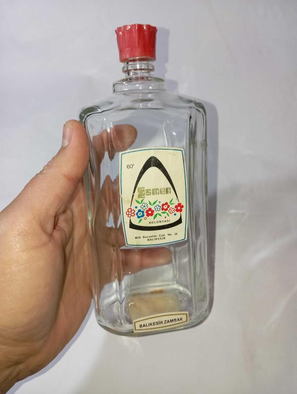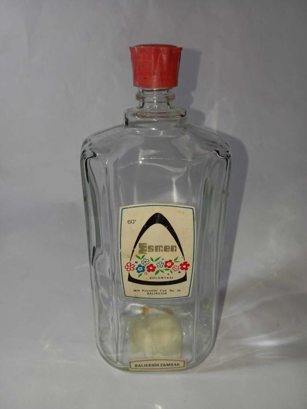 Esmen Balıkesir Zambak kolonya şişesi boş başlıklı antika/koleksiyon objesi Türkiye menşe’lidir. Objenin ait olduğu dönem bilinmeketedir.