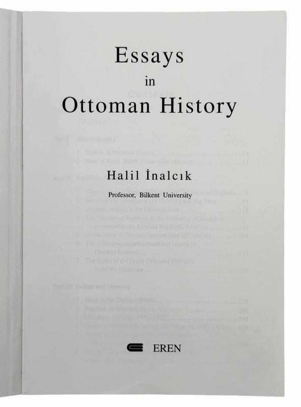 Essays in Ottoman history, HALİL İNALCIK tarafından kaleme alınmıştır. Eser Muhittin Salih Eren editörlüğünde hazırlanmıştır. Kitap 1998 yılında Eren Yayıncılık tarafından [İstanbul] 9757622583 ISBN kodu ile yayınlanmıştır. 445 sayfadır. Essays in Ottoman history adlı eser İngilizce dilindedir.