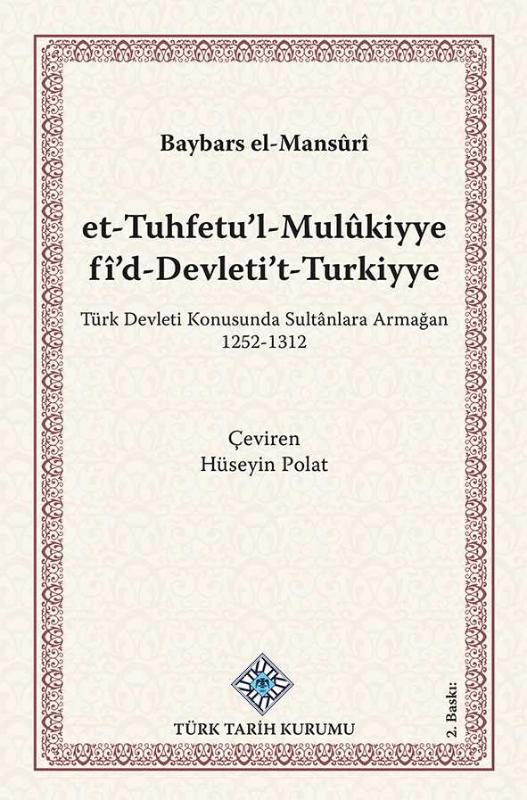 Et-Tuhfetu'L Mulukiyye Fi'D-Devleti't Türkiyye : Türk Devleti Konusunda Sultanlara Armağan, Baybars El Mansuri tarafından kaleme alınmıştır. Kitap 2026 yılında Türk Tarih Kurumu tarafından [Ankara] 9789751631701 ISBN kodu ile yayınlanmıştır. Bu baskının çevirisi Hüseyin Polat tarafından yapılmıştır. 258 sayfadır. Et-Tuhfetu'L Mulukiyye Fi'D-Devleti't Türkiyye : Türk Devleti Konusunda Sultanlara Armağan adlı eser Türkçe dilindedir.