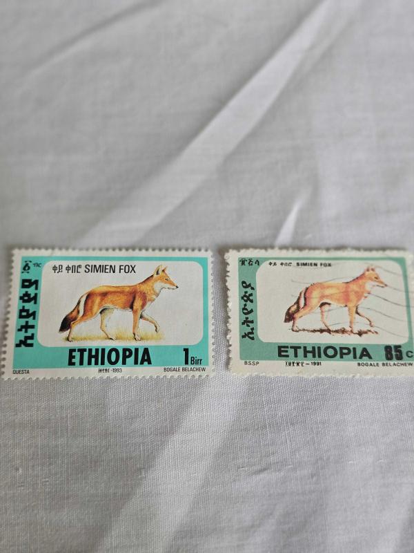 Etiyopya Kurdu'nu (bilimsel adı: Canis simensis) tasvir etmektedir. Bu hayvan, halk arasında sıklıkla Simien Tilkisi olarak da anılır (bu yüzden pulun üzerindeki etiketlerde bu ifade geçmektedir). Afrika'nın en tehlikede olan etoburudur ve yalnızca Etiyopya'nın yüksek irtifalı Afroalp bölgelerinde yaşar. Konu: Simien Tilkisi (Etiyopya Kurdu). Tasarım: Ayakta duran, kızıl-kahverengi kürklü, tilkiye benzer Etiyopya Kurdu figürü. Tasarımcı: BOGALE BELACHEW. Dil: Amharca (üst kısım) ve İngilizce (alt kısım). Görüntüdeki pullar farklı yıllara aittir: Sol Pul 1993 (፲፱፻፺፫) 1 Birr Daha geniş turkuaz kenarlık (QUESTA baskısı olabilir) Sağ Pul 1991 (፲፱፻፺፩) 85 Cent Daha dar yeşil kenarlık (BSSP baskısı olabilir)