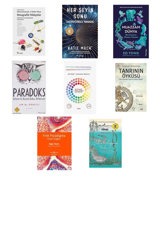 Etnografik Hikayeler: Türkiye'de Alan Araştırması Deneyimleri - Her Şeyin Sonu: (Astrofiziksel Manada) - Muazzam Dünya: Beş Duyunun Ötesine Yolculuk - Paradoks Bilimin En Büyük Dokuz Bilmecesi - Renk Şifresi (Ciltli) - TANRININ ÖYKÜSÜ: Tanrı mı İnsanı, İnsan mı Tanrıyı Yarattı? - Yitik Paradigma: İnsan Doğası - Yılanbalığının Yolu