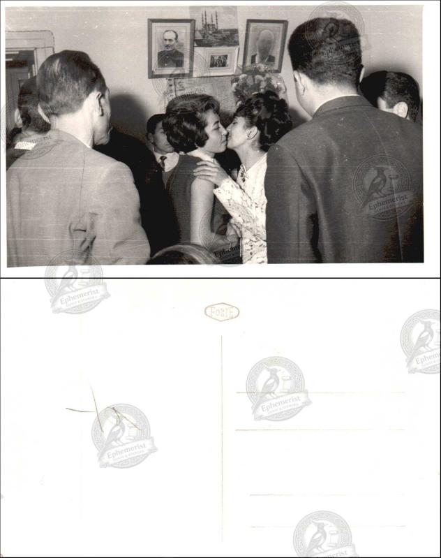 Ev İçi Mekân, Fotoğraf, 1950’ler: Duvarlarda portreler ve harita bulunan bir odada, kalabalık içinde iki kadının selamlaştığı gündelik bir an. başlıklı ürün, Efemera, Müzik, Sinema > Fotoğraflar > Diğer kategorisi altında İkinci El olarak satılmaktadır.