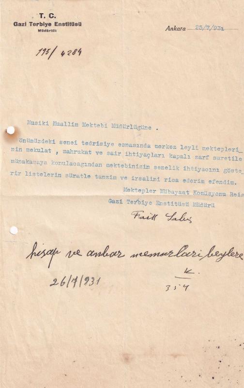 FAİK SABRİ DURAN (1882-1943) - T.C. Gazi Terbiye Enstitüsü Müdürlüğü antetli Musiki Muallim Mektebi Müdürlüğüne yazılmış, merkez leyli mekteplerin gelecek seneki ihtiyaçlarının belirlenmesi konulu, enstitü müdürü Faik Sabri imzalı 1931 tarihli daktiko belge, 2 ay önce satışa sunulmuştur.