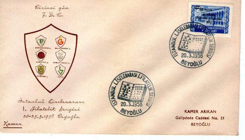 FDC...İLKGÜN ZARFI.İSTANBUL 1.LİSELER FİLATELİ SERGİSİ KAMER ZARF 20.3.1958, 3 yıl önce satışa sunulmuştur.