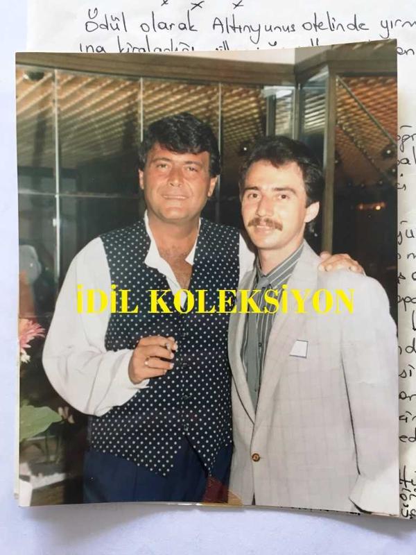 FERDİ ÖZBEĞEN'İN ORİJİNAL FOTOĞRAFI - 15 x 12,5 cm EBADINDA - FERDİ ÖZBEĞEN KAYBETTİĞİ ANA YADİGARI YÜZÜĞÜNÜ BULAN GENCE ALTINYUNUS'TA KİRALADIĞI VİLLAYI 3 YILLIĞINA KULLANMAK ÜZERE ÖDÜL OLARAK VERDİ, FERDİ ÖZBEĞEN ve O GENÇ AYNI KAREDE POZ VERİRKEN ÇEKİLMİŞ BİR FOTOĞRAF ve İLGİLİ HABER NOTUNUN YAZILI OLDUĞU KAĞIT