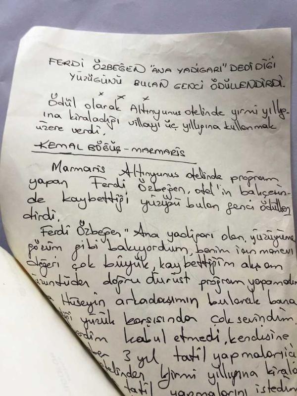 FERDİ ÖZBEĞEN'İN ORİJİNAL FOTOĞRAFI - 15 x 12,5 cm EBADINDA - FERDİ ÖZBEĞEN KAYBETTİĞİ ANA YADİGARI YÜZÜĞÜNÜ BULAN GENCE ALTINYUNUS'TA KİRALADIĞI VİLLAYI 3 YILLIĞINA KULLANMAK ÜZERE ÖDÜL OLARAK VERDİ, FERDİ ÖZBEĞEN ve O GENÇ AYNI KAREDE POZ VERİRKEN ÇEKİLMİŞ BİR FOTOĞRAF ve İLGİLİ HABER NOTUNUN YAZILI OLDUĞU KAĞIT, en son 1 yıl önce güncellenmiştir.