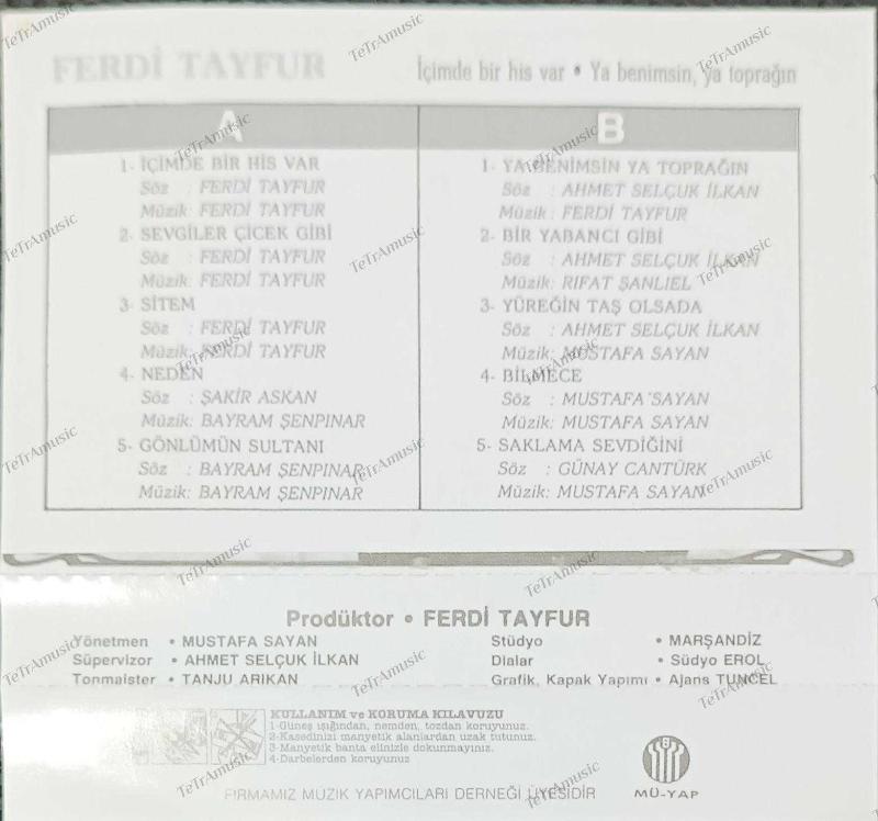 FERDİ TAYFUR İÇİMDE BİR HİS VAR YA BENİMSİN YA TOPRAĞIN TOPRAĞIN başlıklı ürün, Efemera, Müzik, Sinema > Müzik, Plak, Kaset, CD > Müzik Kaseti > Yerli Müzik Kaseti kategorisi altında İkinci El olarak satılmaktadır.
