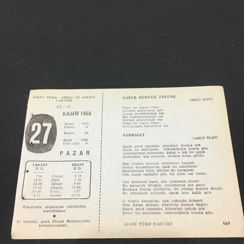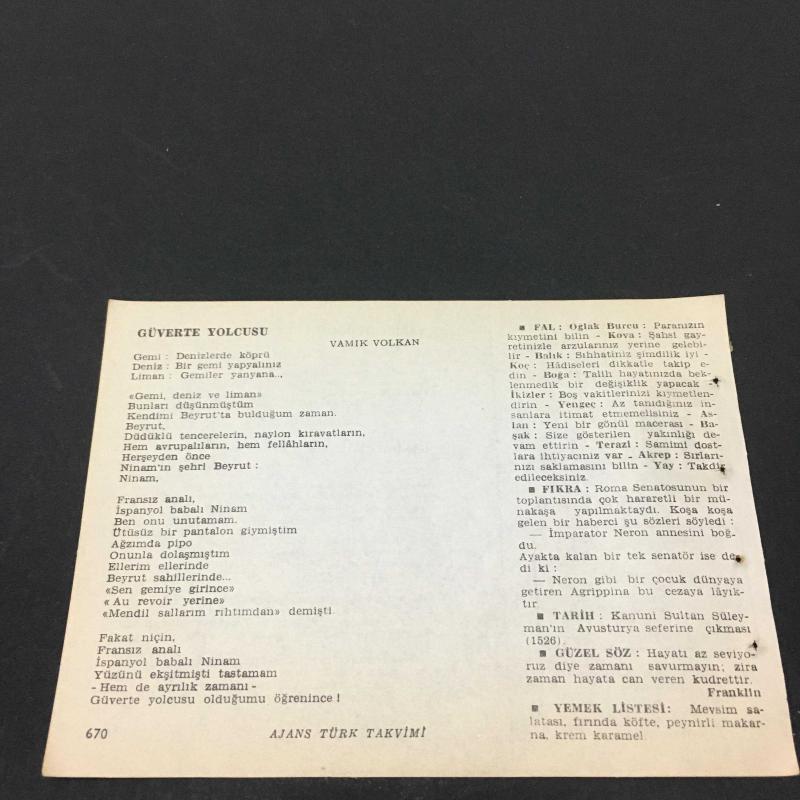 FERİD EDGÜ,CAHİT ÜLKÜ,VAMIK VOLKAN,FAL,FIKRA,KANUNİNİN AVUSTURYA SEFERİNE ÇIKMASI 1526,GÜZEL SÖZ,YEMEK LİSTESİ başlıklı ürün, Efemera, Müzik, Sinema > Belge ve Evraklar > Takvimler kategorisi altında İkinci El olarak satılmaktadır.
