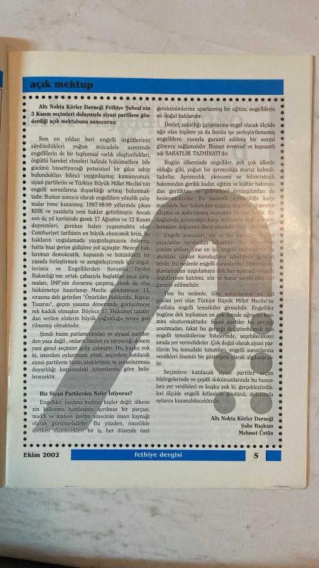 FETHİYE AYLIK FİKİR SANAT DERGİSİ - EKİM 2002 SAYI: 5 RAMAZAN KIVRAK – ERTUĞRUL KOYUNCU – AV. ÖMER KARAYUMAK – ÜNAL ŞÖHRET DİRLİK – MAKBULE N. UYAR – AV. AHMET BESEREK – UĞUR ÇAÇARON – DR. TURGAY ARTUN – ÖZCAN NAS – DOÇ. DR. ERDOĞAN GAVCAR – UFUK EMEK – YRD. DOÇ. DR. FAHRİ YİĞİT – M. İRFAN KILIÇ – PROF. DR. AYHAN ÇIKIN – SEFAİ GÜNER – MESUT KOÇ – DOÇ. DR. REMZİ DURAN – TIMUR FİDAN – YAVUZ TORUNOĞULLARI – BİRDAL CAN TÜFEKÇİ – TAHSİN DURU – ALİ YULUK – YRD. DOÇ. DR. ALİ AKKAYA İSLAM’IN ENGELLİLERE BAKIŞI – ALTINOKTA KÖRLER DERNEĞİ AÇIK MEKTUBU – SAĞLIKLI YAŞAMDA ÖZÜRLÜLERİN YERİ – ZİHİNSEL ENGELLİLERDE EĞİTİMİN ÖNEMİ – KİTAP DÜNYASINDAN – TEKE YÖRESİ – KASIM SEÇİMLERİ VE FETHİYE – EKOLOJİK TARIM – ANA-BABA OLABİLMEK – TÜRKİYE TARIMI İÇİN SAPTAMALAR – 74 YIL ÖNCEKİ BAŞÖĞRETMEN ATATÜRK – SEDEF KIZ VE YAYLA ÇİÇEĞİ – İKİ AVUSTURYALI’NIN 1880 FETHİYE GÖZLEMLERİ – ŞİİR DÜNYASI – FOTOĞRAF – DEĞİŞEN NE OLDU? – SEKİ EŞREF PAŞA TÜRBESİ – TARİHTE BU AY – MEKTUPLAR – - TAM TAKIM EKSİKSİZ 42 SAYFA, RAMAZAN KIVRAK tarafından kaleme alınmıştır. Eser . editörlüğünde hazırlanmıştır. Kitap . tarafından yayınlanmıştır. 42 sayfadır. FETHİYE AYLIK FİKİR SANAT DERGİSİ - EKİM 2002 SAYI: 5 RAMAZAN KIVRAK – ERTUĞRUL KOYUNCU – AV. ÖMER KARAYUMAK – ÜNAL ŞÖHRET DİRLİK – MAKBULE N. UYAR – AV. AHMET BESEREK – UĞUR ÇAÇARON – DR. TURGAY ARTUN – ÖZCAN NAS – DOÇ. DR. ERDOĞAN GAVCAR – UFUK EMEK – YRD. DOÇ. DR. FAHRİ YİĞİT – M. İRFAN KILIÇ – PROF. DR. AYHAN ÇIKIN – SEFAİ GÜNER – MESUT KOÇ – DOÇ. DR. REMZİ DURAN – TIMUR FİDAN – YAVUZ TORUNOĞULLARI – BİRDAL CAN TÜFEKÇİ – TAHSİN DURU – ALİ YULUK – YRD. DOÇ. DR. ALİ AKKAYA İSLAM’IN ENGELLİLERE BAKIŞI – ALTINOKTA KÖRLER DERNEĞİ AÇIK MEKTUBU – SAĞLIKLI YAŞAMDA ÖZÜRLÜLERİN YERİ – ZİHİNSEL ENGELLİLERDE EĞİTİMİN ÖNEMİ – KİTAP DÜNYASINDAN – TEKE YÖRESİ – KASIM SEÇİMLERİ VE FETHİYE – EKOLOJİK TARIM – ANA-BABA OLABİLMEK – TÜRKİYE TARIMI İÇİN SAPTAMALAR – 74 YIL ÖNCEKİ BAŞÖĞRETMEN ATATÜRK – SEDEF KIZ VE YAYLA ÇİÇEĞİ – İKİ AVUSTURYALI’NIN 1880 FETHİYE GÖZLEMLERİ – ŞİİR DÜNYASI – FOTOĞRAF – DEĞİŞEN NE OLDU? – SEKİ EŞREF PAŞA TÜRBESİ – TARİHTE BU AY – MEKTUPLAR – - TAM TAKIM EKSİKSİZ 42 SAYFA adlı eser Türkçe dilindedir.