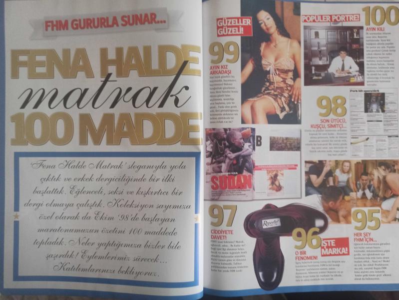 FHM Aktüalite Sinema Tiyatro Müzik ve Gençlik Mecmuası Dergisi - Kasım 2005 - Tera Cevaplıyor - Dünyadan Seks - FHM Melekleri - Arka Depo - FHM Spor - Takıl - Hastane - Sophia Marceau - Hayvanlar Alemi - Atari Salonu mu Dediniz? - Kuklalar Sahneye! - Nostaljik Kafe - X Large Sloganla - Dünyanın En Sinir Projeleri - Hızlı Biraderler - Doğum Günü Pastası - Melissa George - Dünyadan Seks - Minki Van Der Westhuizen - Charlize Theron - Mickey Rourke - Güzeller Güzeli - Azra Akın - Her Şey Film İçin - O Bir Fenomen - Ciddiyete Davet! - Depremzedelere Yardım - Özlem Tekin Soyundu - Tatil Olayı - Tam İsabet - Biz Keşfettik - Ansiklopedi Çıkarttık - Baydık Baydırdık! - Hepsi Bir Arada - Feministleri Kızdırdık - Ruhunuzu Besledik - Oskar Dağıttık - Hollywood'u Bile Solladık - FHM Gazete Günleri - Seks Sırlarını Açığa Çıkarttık! - Mutfakta Biri Var - Okurlarla Buluştuk - Biz 5 Yaşındayken - Sürgündeki Tarih - En Hassas Konular FHM'de - Global Seks Araştırması fotoğraf ve haberi - Tam Takım Dergi Yıpranma, sararmalar ve yırtılmalar zamana bağlı olarak görülebilir.