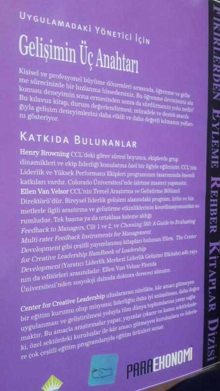 FİKİRLERDEN EYLEME Rehber Kitaplar Dizisi: UYGULAMADAKİ YÖNETİCİ için.. The Center for Creative Leadership (CCL), series of guidebooks ©2004.. 9 kitap, The Center for Creative Leadership (CCL) tarafından kaleme alınmıştır. Eser CCL – Rota Yayın editörlüğünde hazırlanmıştır. Kitap 2004 yılında UKM - Para Ekonomi Dergisi Eki tarafından [İstanbul] yayınlanmıştır. Satışta olan kitap, yayınevinin 1. baskısıdır. Bu baskının çevirisi Sinem Vatanartıran tarafından yapılmıştır. Sayfa bilgisi 1.hamur olarak belirtilmiştir. FİKİRLERDEN EYLEME Rehber Kitaplar Dizisi: UYGULAMADAKİ YÖNETİCİ için.. The Center for Creative Leadership (CCL), series of guidebooks ©2004.. 9 kitap adlı eser Türkçe dilindedir.