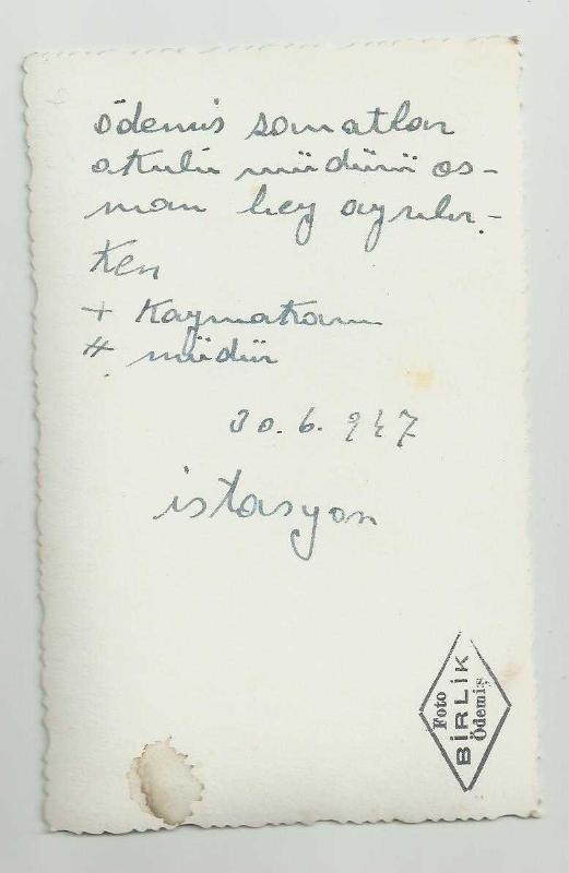 ** FOTO BİRLİK - ÖDEMİŞ / 1947 ÖDEMİŞ SANATLAR OKULU MÜDÜRÜ GİDERKEN İSTASYONDA FOTOĞRAF ** Yaklaşık kartpostal boyutunda,gayet iyi kondüsyonda,arkası yazılı,30 Haziran 1947 tarihli,orijinal dönem fotoğrafı...