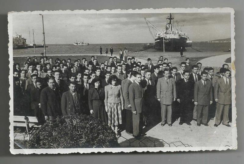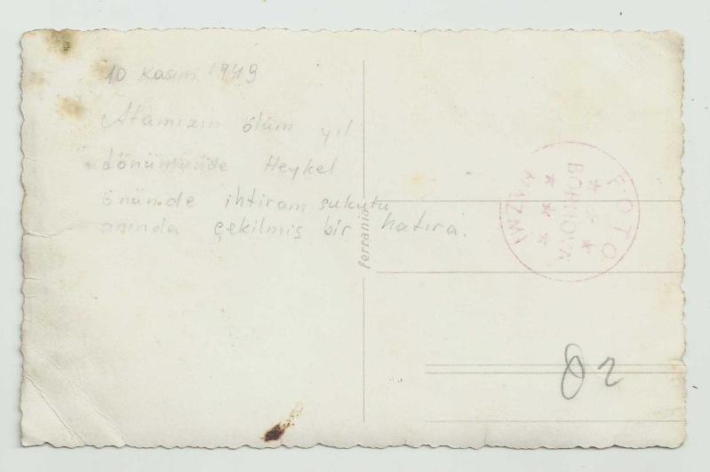 ** FOTO NAZMİ - BORNOVA / 10 KASIM 1949 ATA'NIN HEYKELİ ÖNÜNDE SAYGI DURUŞU TEMALI FOTOĞRAF ** Yaklaşık kartpostal boyutunda,arkası hem yazılı hemde fotoğrafçı kaşeli olan, sağ alt kulakçığı kırık olmasına rağmen devamı gayet iyi kondüsyonda, dönem çekimi Ata'yı anma konulu orijinal fotoğraftır... Sahilde bir Yunan gemisi bağlı karaya.. Solda ise Pasaport iskelesinin ucu görünüyor..
