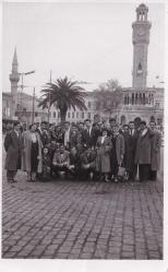 İzmir Konak Saat Kulesi önünde şık giyimli kadın ve erkeklerden oluşan topluluk, muhtemelen 1960'lı yıllar. 14x9 cm.