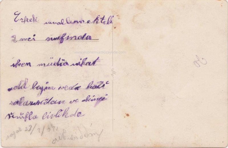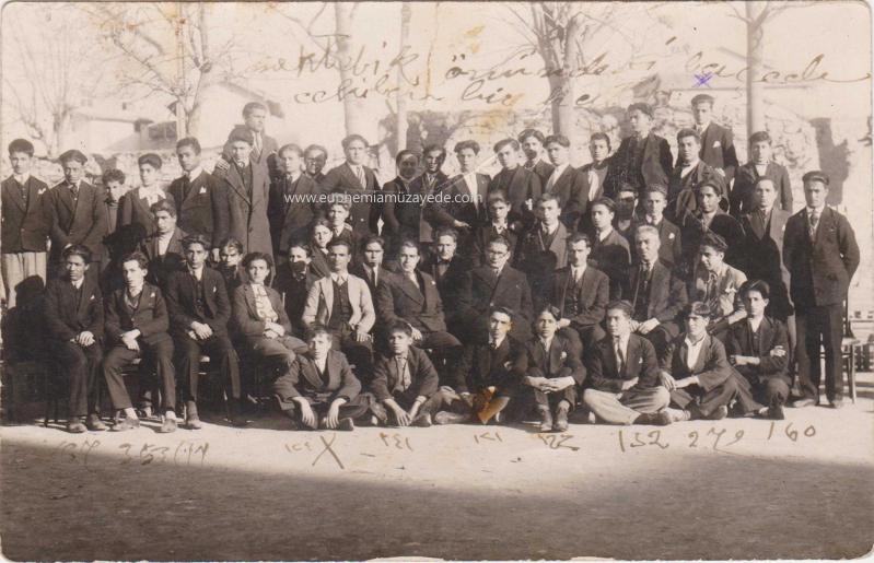 Erkek Muallim Mektebi İkinci Sınıf Talebesi ve Müdür Rifat Adil Bey okulun bahçesinde bir arada, 22.3.1931 tarihlidir. Arka yüzü açıkalmalıdır. 14x9 cm, fotoğraf üzerinde not ve okul numaraları bulunur, arka yüzde sararma ve not bulunmaktadır.