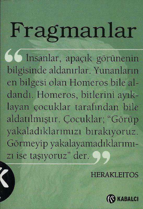 FRAGMANLAR, Herakleitos tarafından kaleme alınmıştır. Kitap 2016 yılında Kabalcı Yayıncılık tarafından [İstanbul] 978-605-9872-34-8 ISBN kodu ile yayınlanmıştır. Bu baskının çevirisi Arzu Akgün tarafından yapılmıştır. FRAGMANLAR adlı eser Türkçe dilindedir.