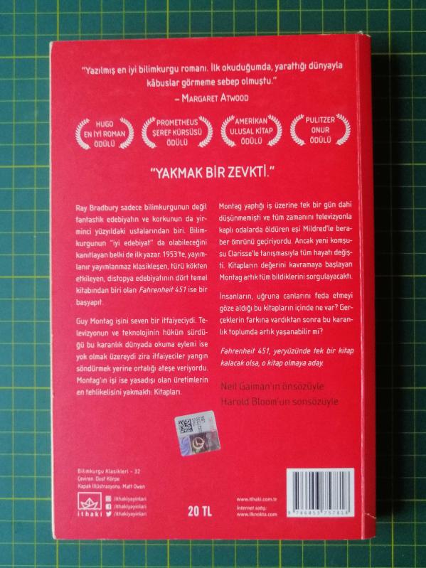 Fahrenheit 451, Ray Bradbury tarafından kaleme alınmıştır. Kitap 2018 yılında İthaki Yayınları tarafından [İstanbul] 9786053757818 ISBN kodu ile yayınlanmıştır. 202 sayfadır. Fahrenheit 451 adlı eser Türkçe dilindedir.