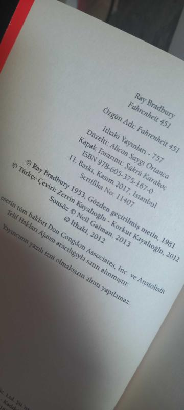 Kitapların olmadığı bir gelecek hayal edebiliyor musunuz? Hayatını kitapları yakarak kazanan İtfaiyeci Montagin hikâyesini okurken kitaplarınızın değerini daha iyi anlayacaksınız Neredeyse hiç kimse Ray Bradburynin kurgusu olmayan bir zaman ya da mekân hayal edemez Hikâyeleri ve romanları Amerikan edebiyatının vazgeçilmezleri arasında. Jeffrey A. Frank The Washington Post