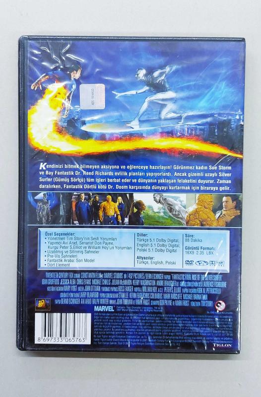 Fantastik Four - Rise of the Silver Surfer filminin DVD versiyonu. Film hiç açılmamış, ambalajlıdır. Marvel ve Fantastic Four koleksiyonerleri için harika bir parçadır. Türkçe altyazı ve Türkçe dublaj seçenekleri mevcuttur. *Özel Seçenekler* - Yönetmen Tim Story'nin Sesli Yorumları - Yapımcı Avi Arad, Senarist Don Payne, Kurgu Peter S. Elliot ve William Hoy'un Yorumları - Uzatılmış ve Silinmiş Sahneler - Pre-Vis Sahneleri - Fantastik Araba: Son Model - Dört Element Toplam 101 dakikadır fakat özel seçeneklerle birlikte daha uzun bir ekran süresi sağlanmaktadır.