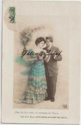 Fantezi Kart: Mavi Desenli Elbisesi ve Elinde Çiçeklerle Kadın ile Takım Elbiseli Erkek