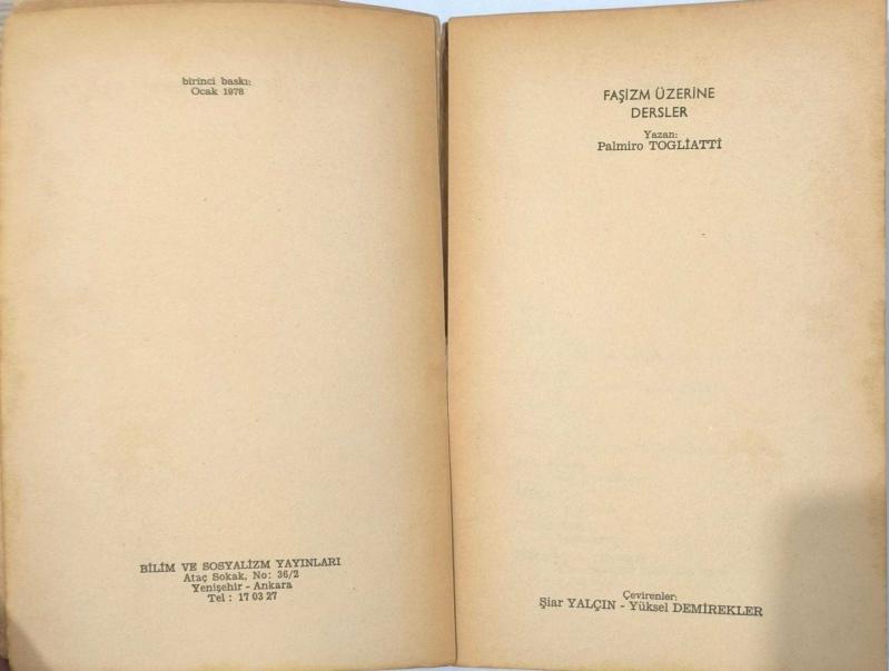 Faşizm Üzerine Dersler, siyasal düşünce ve ideoloji tarihiyle ilgilenen okurlar için dikkat çekici bir kaynak niteliği taşıyan önemli bir eserdir. Palmiro Togliatti’nin faşizm olgusuna ilişkin değerlendirmelerini bir araya getiren bu kitap, özellikle sosyalist yayınlar, politik metinler ve dönem baskıları toplayanlar için ilgi çekici bir nüshadır. İçeriği kadar dönem ruhunu yansıtan baskı karakteriyle de arşivlik ve koleksiyonluk değer taşır. Kondisyon: Kapakta genel yıpranma, kenar ve köşe aşınmaları mevcuttur. Ciltte hafif ayrılma vardır. İç sayfalarda yaşa bağlı sararma görülmektedir. Genel olarak temiz olmakla birlikte yorgun bir nüsha görünümündedir.