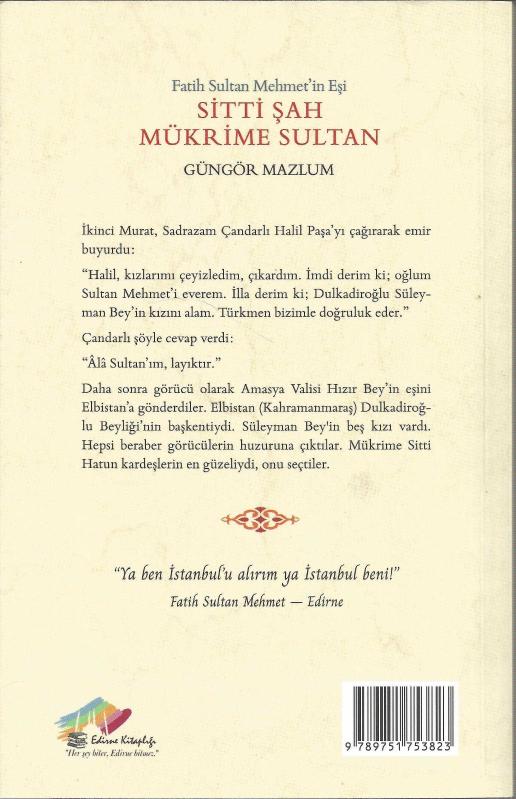 Fatih Sultan Mehmet'in Eşi Sitti Şah Mükrime Sultan, Güngör Mazlum tarafından kaleme alınmıştır. Kitap 2023 yılında Edirne Valiliği Kültür Yayınları tarafından [Edirne] 9789751753823 ISBN kodu ile yayınlanmıştır. Satışta olan kitap, yayınevinin 1. baskısıdır. 270 sayfadır. Fatih Sultan Mehmet'in Eşi Sitti Şah Mükrime Sultan adlı eser Türkçe dilindedir.
