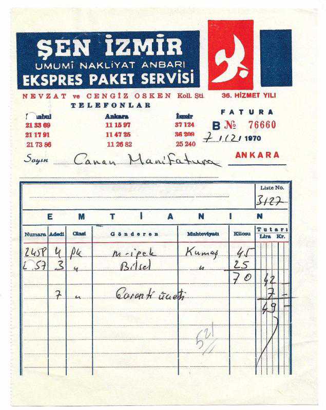 Fatura: Şen İzmir Umumi Nakliyat Ambarı Ekspres Paket Servisi / Ankara / 1970 / Pullu, en son 1 yıl önce güncellenmiştir.