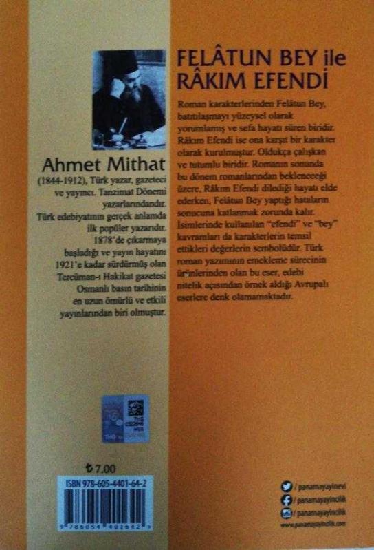Felatun Bey ile Rakım Efendi, Ahmet Mithat Efendi tarafından kaleme alınmıştır. Kitap 2017 yılında Panama tarafından yayınlanmıştır. 176 sayfadır. Felatun Bey ile Rakım Efendi adlı eser Türkçe dilindedir.