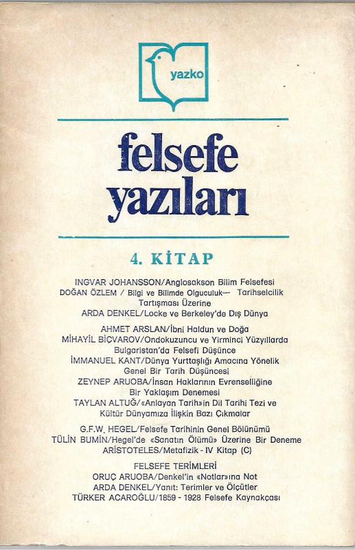 Felsefe Yazıları (4. Kitap), Haz: Selahattin Hilav tarafından kaleme alınmıştır. Kitap 1982 yılında Yazko /Felsefe tarafından [İstanbul] yayınlanmıştır. 192 sayfadır. Felsefe Yazıları (4. Kitap) adlı eser Türkçe dilindedir.