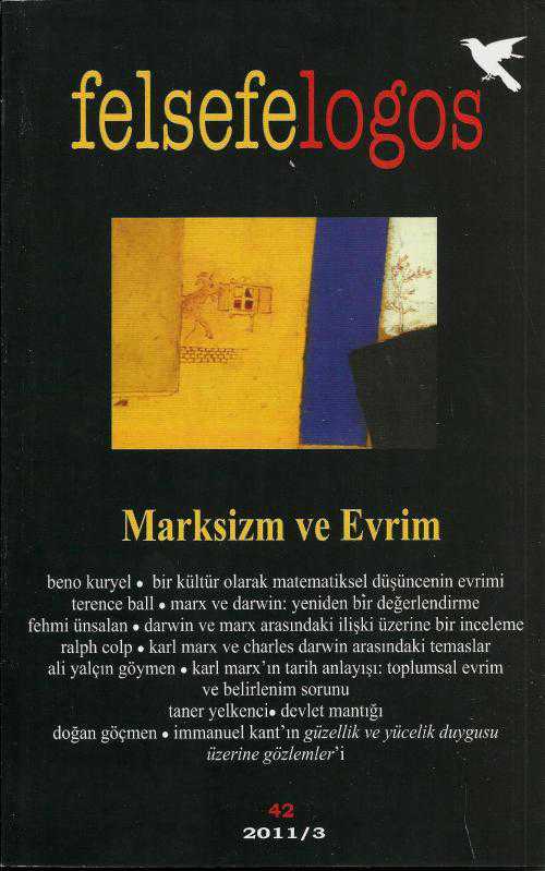163 s.; 15x24 cm. Makale sonlarında kaynakça var. õ õBeno Kuryel "Bir Kültür olarak Matematiksel Düşüncenin Evrimi" õTerence Ball "Marx ve Darvin: Yeniden Bir Değerlendirme" õMitchell Aboulafi "Engels, Darvin ve Hegel'in Olumsallık Düşüncesi" õFehmi Ünsalan "Darwin ve Marx Arasındaki İlişki Üzerine Bir İnceleme" õAli Yalçın Göymen"Karl Marx'ın Tarih Anlayışı: Toplumsal Evrim ve Belirlenim Sorunu" õRalph Colp "Karl Marx ve Charles Darwin Arasındaki Temaslar" õMehmet Cem Kamözüt "Bilimin Normotif alanda Söz Söyleme Olanağı ve Sosyal Darwinizm" õTamer Yıldırım "John Desmond Bernal ve (D)evrim üzerine" õTaner Yelkenci "Devlet Mantığı" õDoğan Göçmen "Immanuel Kant'ın Güzellik ve Yücelik Duygusu üzerine Gözlemler'i" õBora Erdağı - Taner Yelkenci "Uluğ Nutku: Logos'un Peşinde Sarhoş Gemi"