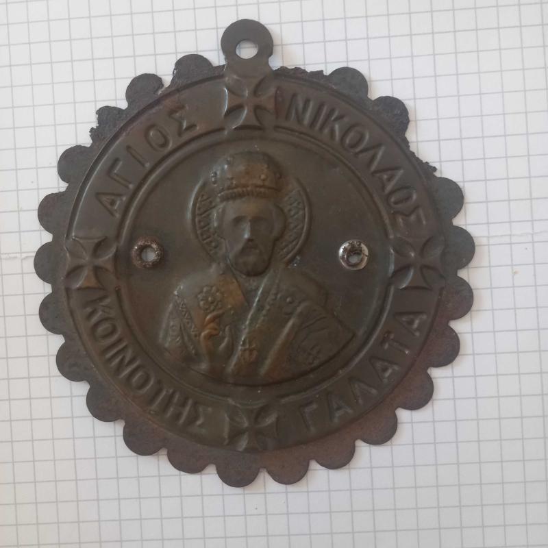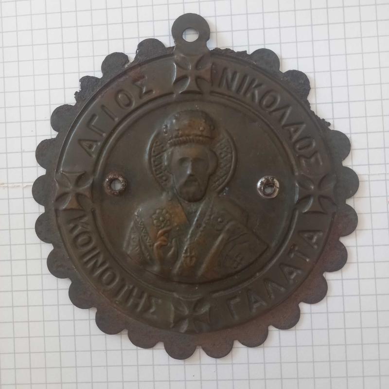 Fener Rum Patrikhanesi Galata cemaatine ait üzrinde Yunanca Aziz Nikola galata cemaati yazılı pirinç ikona
