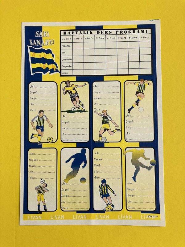 Sarı Kanaryalar Fenerbahçe Nostaljik Ders Programlı Okul Etiketi Çıkartma Tabaka Kendinden yapışkanlı, kullanıma hazır, 1980'li Yıllardan Nostaljik Ürün. Tabakada toplam 9 adet çıkartma etiket var. Kullanılmamıştır.