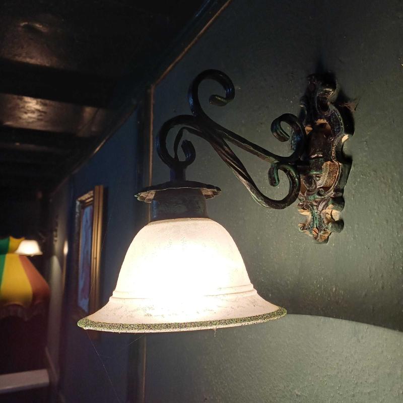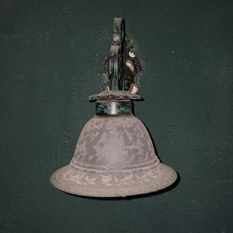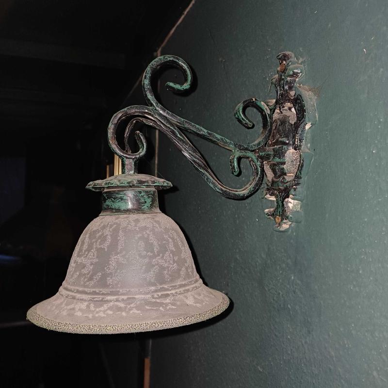 Özel üretim. Izmirli Or-öz firmasi tarafindan uretilmistir. Ferforje duvar apligi.(dolu demirlerle yapilmis) Koyu yesil ve siyah eskitme renkte. Cam çan şeklinde mat ve dokulu. Toplam yukseklik 26 cm. Duvardaki kaide 20x10 cm Duvardan kol mesafesi 20cm Cam capi 17 cm. Normal duyu. Stokta iki adet mevcuttur. Fiyat bir tanesi icin gecerlidir.