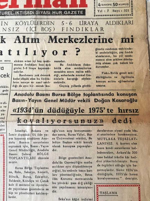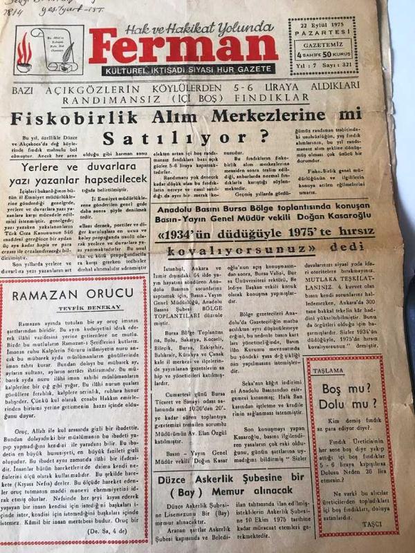 Ferman Kültürel İktısadi Siyasi Hür Gazete 22 Eylül 1975 Fiskobirlik Alım Merkezlerine mi Satılıyor -Yerlere ve duvarlara yazı yazanlar hapsedilecekler Anadolu Basını Bursa Bölge toplantısında konuşan Basın-Yayın genel müdür vekili Doğan Kasaroğlu 1934 'ün düdüğüyle 1975 te hırsız kovalıyorsunuz dedi- Düzce Askerlık Şubesıne bir ( bay) memur alınacak -Köylerdeki Eğitim Sorunu -Sanat ve Edebiyat - Düzcespor Çarşamba günü rakip sahada Kastamonu spor ile oynayacak Yıpranma, sararmalar, kupon kesiği ve yırtılmalar zamana bağlı olarak görülebilir.