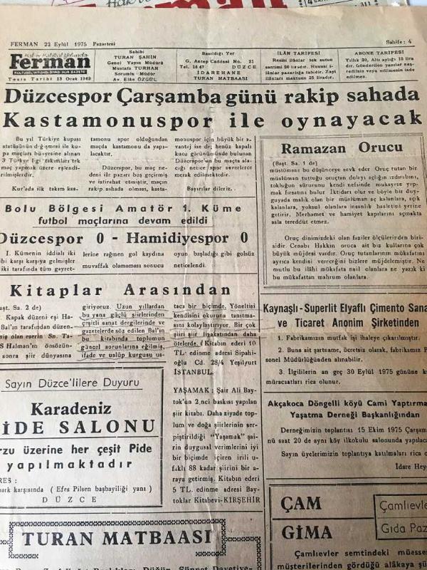 Ferman Kültürel İktısadi Siyasi Hür Gazete 22 Eylül 1975 Düzce yerel,taşra basını-Fiskobirlik Alım Merkezlerine mi Satılıyor -Yerlere ve duvarlara yazı yazanlar hapsedilecekler Anadolu Basını Bursa Bölge toplantısında konuşan Basın-Yayın genel müdür vekili Doğan Kasaroğlu 1934 'ün düdüğüyle 1975 te hırsız kovalıyorsunuz dedi- Düzce Askerlık Şubesıne bir ( bay) memur alınacak -Köylerdeki Eğitim Sorunu -Sanat ve Edebiyat - Düzcespor Çarşamba günü rakip sahada Kastamonu spor ile oynayacak, Turan ŞAHİN tarafından kaleme alınmıştır. Eser Mustafa Turan editörlüğünde hazırlanmıştır. Kitap 1975 yılında BELL tarafından [idare hane turan matbası ] yayınlanmıştır. 4 sayfadır. Ferman Kültürel İktısadi Siyasi Hür Gazete 22 Eylül 1975 Düzce yerel,taşra basını-Fiskobirlik Alım Merkezlerine mi Satılıyor -Yerlere ve duvarlara yazı yazanlar hapsedilecekler Anadolu Basını Bursa Bölge toplantısında konuşan Basın-Yayın genel müdür vekili Doğan Kasaroğlu 1934 'ün düdüğüyle 1975 te hırsız kovalıyorsunuz dedi- Düzce Askerlık Şubesıne bir ( bay) memur alınacak -Köylerdeki Eğitim Sorunu -Sanat ve Edebiyat - Düzcespor Çarşamba günü rakip sahada Kastamonu spor ile oynayacak adlı eser Türkçe dilindedir.