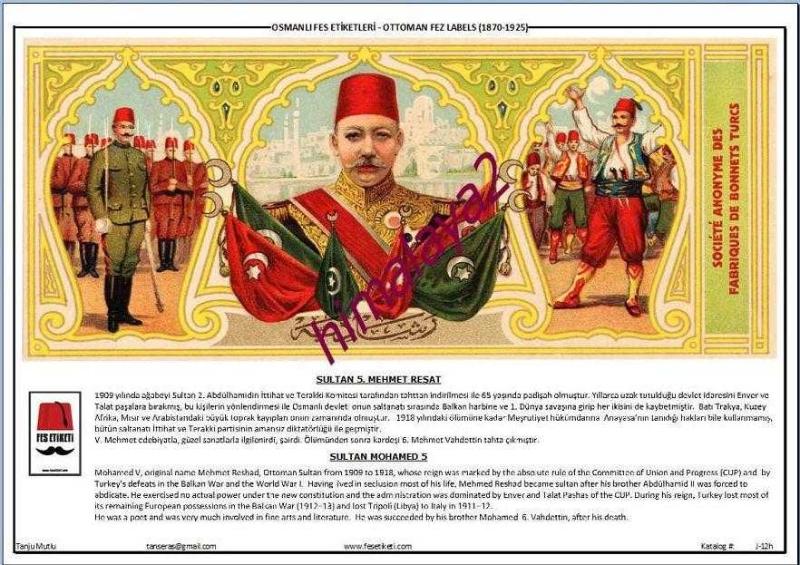 Fes Etiket Panosu, Türkçe ve İngilizce, SULTAN 5. MEHMET REŞAT konulu başlıklı antika/koleksiyon objesinin menşei belirtilmemiştir. Objenin ait olduğu dönem bilinmeketedir.
