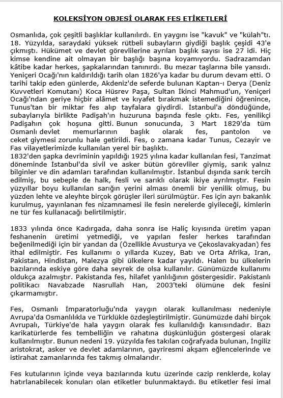 1826-1925 arası tüm erkekler tarafından giyilmiş olan FES giysisi hakkında renkli bir dünya: ORİJİNAL FES ETİKETİ EN AZ 100 YILLIK OSMANLI KÜLTÜR MİRASI Baskı tekniklerinin az gelişmiş olduğu bir zamanda çok renkli mükemmel baskı ve vernik tekniği Osmanlı kültüründen gerçek bir parça, Eğitici bir tarih koleksiyonu Basıldığı günlerin popüler temalarını gösterir 20,000 TL ve üstü fes etiketi alan müşterilermize FES ETİKETİ EXCEL KATALOG LİSTESİ gönderilir. Varyasyonlar ve nadirlik dereceleri gösterilmektedir. Çerçevelemeye uygun Lütfen, diğer ürünlerime de bakınız.