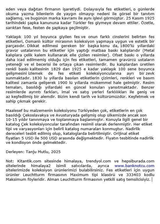 1826-1925 arası tüm erkekler tarafından giyilmiş olan FES giysisi hakkında renkli bir dünya: ORİJİNAL FES ETİKETİ EN AZ 100 YILLIK OSMANLI KÜLTÜR MİRASI Baskı tekniklerinin az gelişmiş olduğu bir zamanda çok renkli mükemmel baskı ve vernik tekniği Osmanlı kültüründen gerçek bir parça, Eğitici bir tarih koleksiyonu Basıldığı günlerin popüler temalarını gösterir Çerçevelemeye uygun Lütfen, diğer ürünlerime de bakınız.