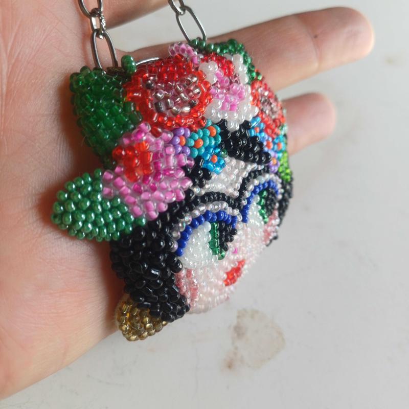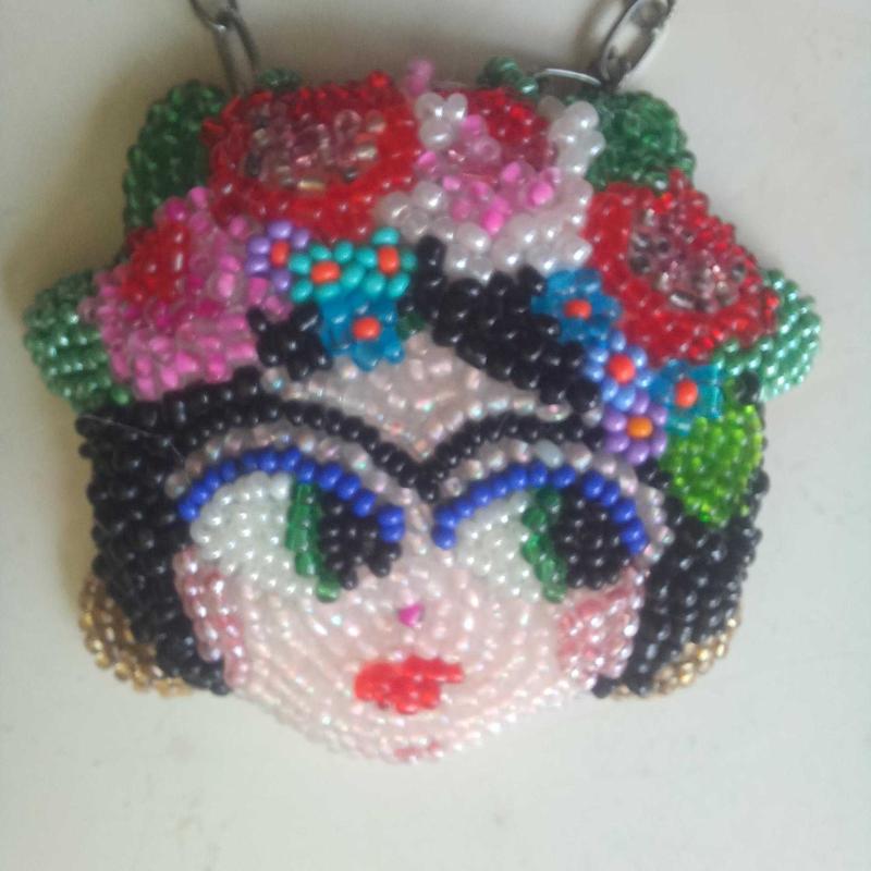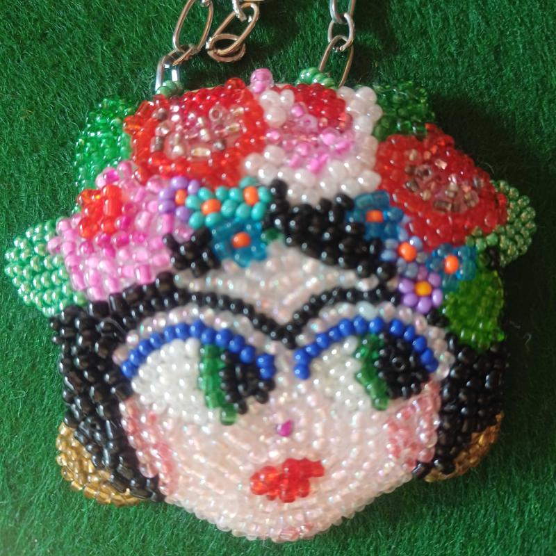 El yapımı. Yüzlerce boncukla itina ile işlenmiş. Küpeleri,saçında çiçekleri,kırmızı dudakları ve kocaman gözleri ile bir Frida Kahlo portresi. İster kolye ucu,ister bros olarak kullanın. Zincir temsilidir ve fiyata Dahil Değildir. Bros olarak kullanmak isterseniz,arkasına bir iğne yapistirmaniz yeterli olacaktır. Hiç kullanılmamış . Özel tasarım.Sanatci eseri.