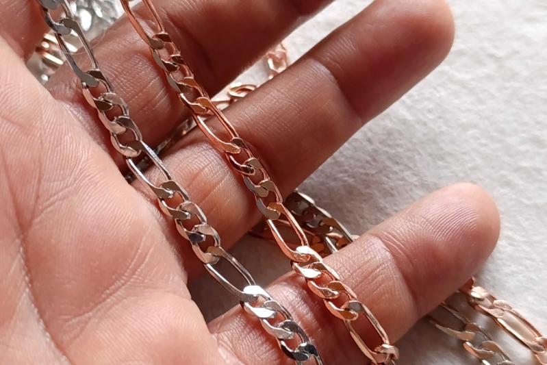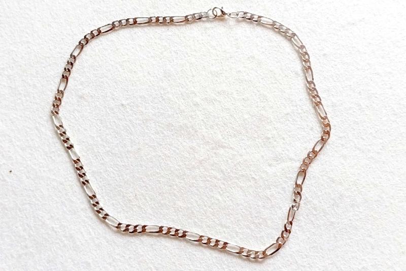 Figaro model Bay-Bayan Pirinç kolye. 47cm boyunda. 5mm genişliğinde. Gümüş renginde ve rodajlıdır, Kararmaz.