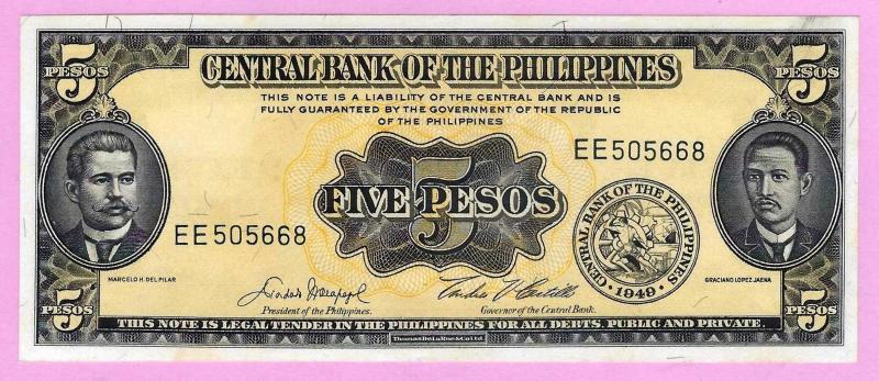 Filipinler, 5 Pesos, 1949-1969, ÇİL, p135e (TK 17 199) ÇİL, 4 ay önce satışa sunulmuştur.