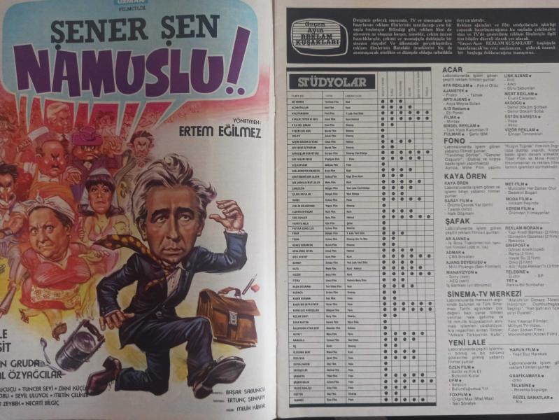 Film Market Aylık Filmcilik ve Sinemacılık Dergisi - Eylül 1984 - Yaprak Özdemiroğlu - Sinema Dünyamızdan - Yeni Mevsimin Filmleri - Mimeray'dan - Geçen Ayın Ardından - Baha Gelenbevi Öldü - Naci Duru'yu Yitirdik - Süreyya Duru - Namuslu Filmi - Şener Şen - Adile Naşit - Ayşen Gruda - Erdal Özyağcılar - Geçen Ayın Reklam Kuşakları - 21. Antalya Ulusal Altın Portakal Film Yarışması - Atla Gel Şaban Filmi - Natuk Baytan - Kemal Sunal - Rafet Şiriner - Nevra Serezli - Mehmet Soyarslan İle Bir Söyleşi - Sansür Raporu - ÖC Filmi - Mesut Uçakan - Salih Kırmızı - Sümer Tilmaç - Bulut Aras - Oya Aydoğan - Mahmut Hekimoğlu - Uzkan Film A.Ş. Mektubu - Fidan Filmi - Fikret Hakan - Talat Bulut - Nur Sürer - Şaşkın Gelin - Meral Zeren - Suna Yıldızoğlu - Darbe Filmi - Salih Güney - Bahar Öztan - Nilgün Saraylı - Engin Çağlar - Öztürk Serengil - Bülent Bilginç - Gülümseyen Dünya - Zeki Alasya - Müjdat Gezen - Perran Kutman - Bora Ayanoğlu - Altan Erbulak - Dünya - Venedik Film Festivali Tarihçesi - Stanley Kubrick - Francis F. Coppola - Kısa Türk Sineması Tarihçesi - James Mason Öldü - Tehlikeli Yaşama Yılı Filmi - Hendekteki Ayışığı Filmi - Fanny ile Alexandre Filmi - Tender Mercies fotoğraf ve haberi - Lawrence Simmons - Video ve Teknik - Basında Video - Güneş Doğarken Filmi - Kadir İnanır - Hülya Avşar - Şerif Gören fotoğraf ve haberi - Tam Takım Dergi Yıpranma, sararmalar, kupon kesiği ve yırtılmalar zamana bağlı olarak görülebilir